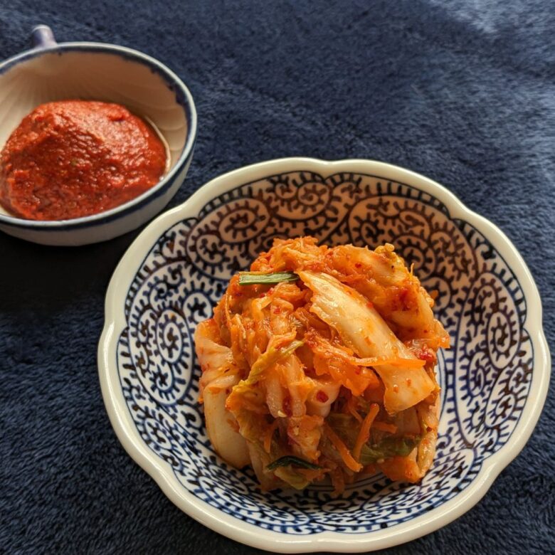 キムチは厳寒期に備えた保存食。塩漬けした野菜に唐辛子・ニンニク等多種多様な食材が混ざり、乳酸発酵による酸味旨味塩辛さが混じり合っています。