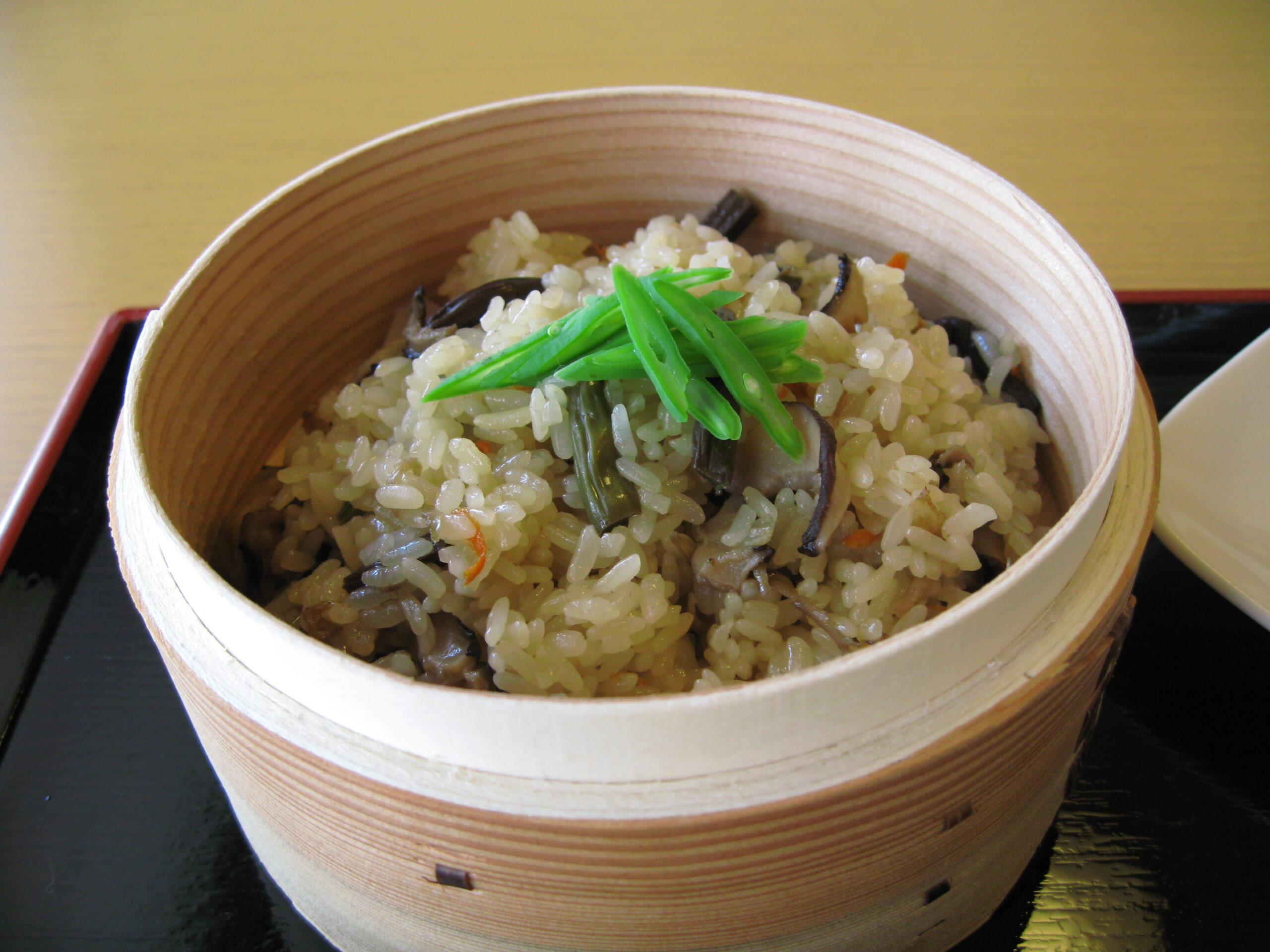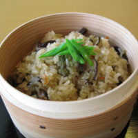 信州の秋の味覚!きのこは複数種を使うことで風味が増します。旬のきのこに加えて、乾燥きのこ数種をたっぷり 使った「きのこおこわ」と、
