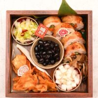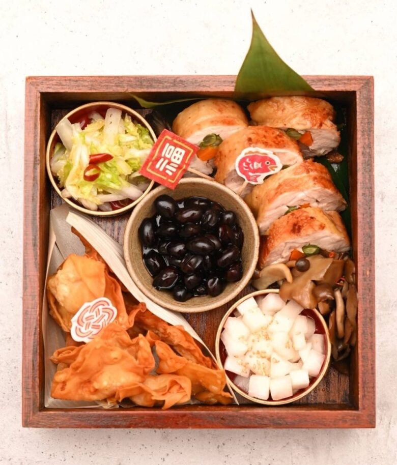 黒豆黒糖煮・白菜甘酢ずけ・大根のカクテキ風・キノコの中華マリネ・鶏肉の黒酢ロール・海老の揚げワンタン等です。