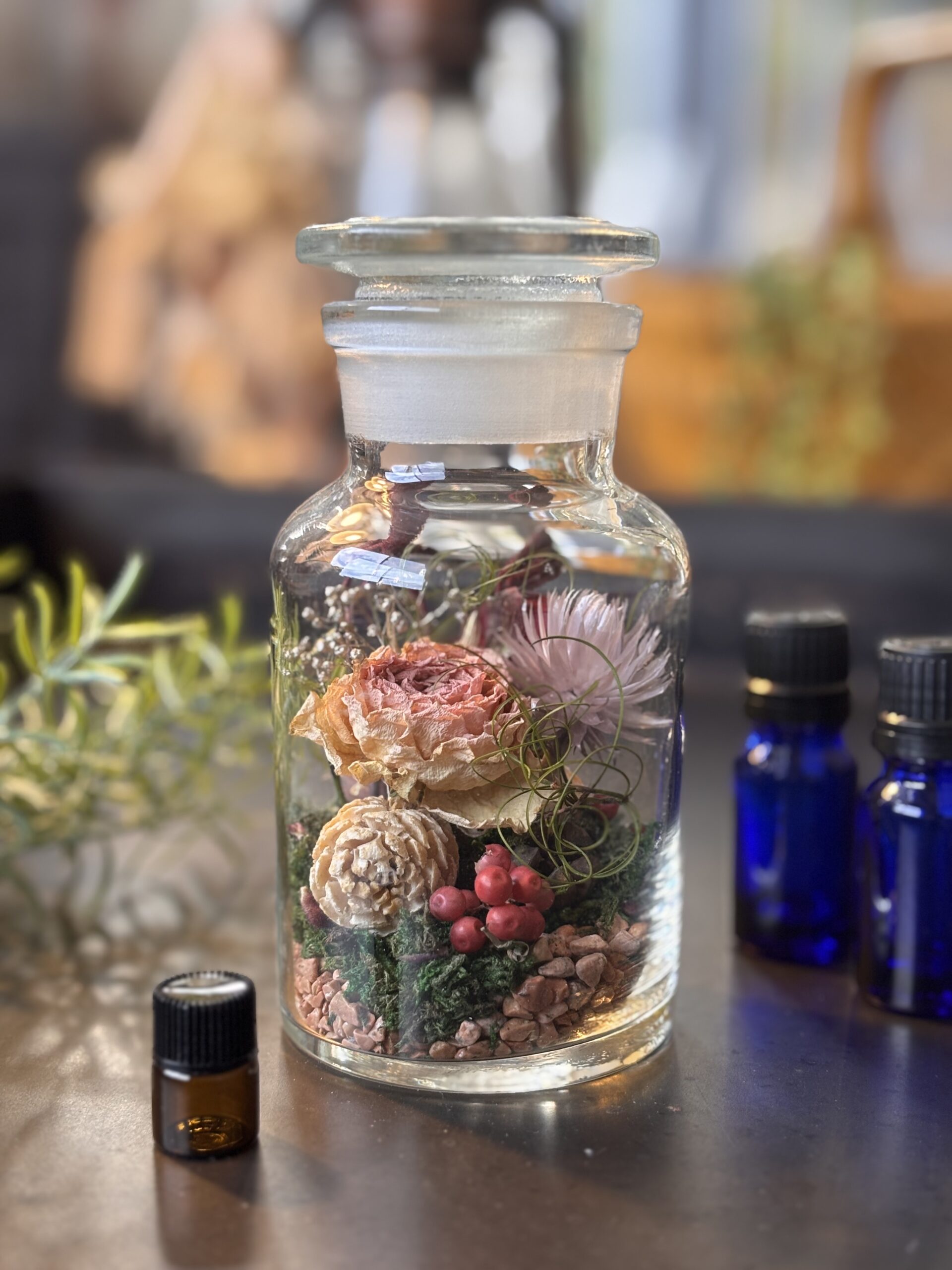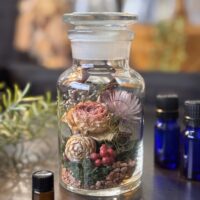 ドライフラワーやモス、木の実等を自由に配置し更にお好みでブレンドした精油をボトル内に